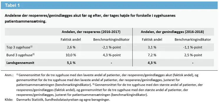 Selv når der tages højde for forskelle i sygehusenes patientsammensætning, er der stadig betydelige forskelle mellem sygehusene, jf. tabel 1. Det måles ved en såkaldt benchmarkingindikator, der viser, om sygehuset har flere eller færre reoperationer og genindlæggelser, end man kunne forvente, når der tages højde for patientsammensætningen. Eksempelvis er der blandt de tre sygehuse, der klarer sig dårligst i forhold til reoperationer, i gennemsnit 4,3 procentpoint flere patienter, der bliver reopereret, end man kunne forvente på baggrund af sygehusenes patientsammensætning. Det skal ses i forhold til, at det på landsplan er 5,1 procent af patienterne, der får en reoperation.