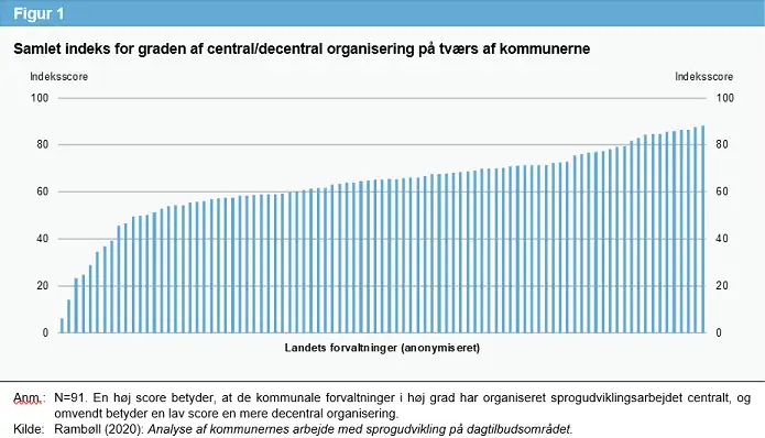 De fleste forvaltninger involverer sig i dagtilbuddenes arbejde med børnenes sprogudvikling, men der er forskelle mellem kommunerne ift. hvor centraliseret arbejdet er. Det ses i figur 1 nedenfor. Den viser kommunernes placering på et samlet indeks for kommunens rammesætning, understøttelse og opfølgning ift. sprogudviklingsarbejdet i dagtilbuddene.